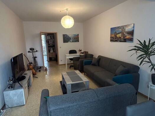Die Wohnung bietet eine geräumige, teilweise zum Wohnzimmer hin offene Küche mit viel Platz für Küchenmöbel sowie für einen Sitz- /Essbereich. Die Küche und das Bad besitzen Fenster. Im Bad sind WC, Handwaschbecken, Badewanne und Dusche sowie der Waschmaschinenanschluss angeordnet. Integrierte Deckenspots sorgen für eine entspannte Atmosphäre im Bad. Ausgestattet sind die Wohnräume mit Laminat, im Bad mit Fußbodenfliesen. Bei Bedarf steht auf dem Hofbereich ein Pkw-Stellplatz für zzgl. 35 EUR/m...