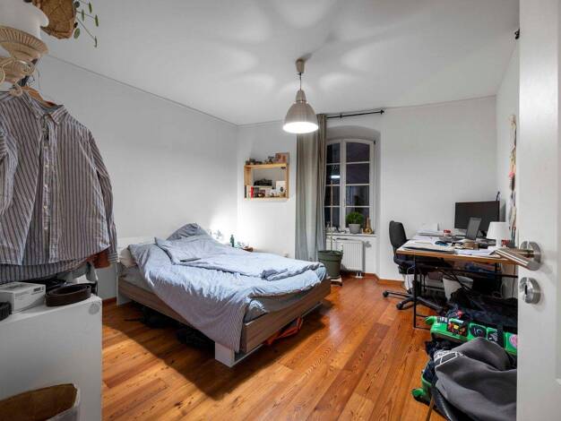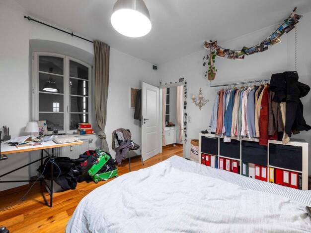 Zimmer Dein Zimmer liegt am Anfang der Wohnung und ist zum Innenhof ausgerichtet. Durch das große Fenster scheint den ganzen Tag viel Licht in den Raum. Dank des Altbaus ist die Wohnung im Sommer nie...