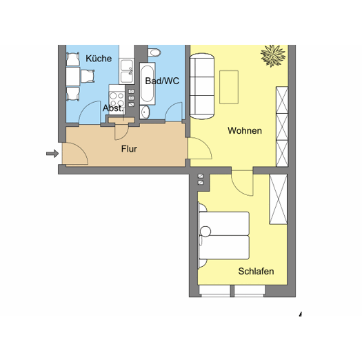 Die helle 2-Raumwohnung befindet sich in einem ruhigen, kleinen Mehrfamilienhaus im 1. Obergeschoss. Auf ca. 40m ² bietet sie eine Küche, ein Tageslichtbad mit Dusche, ein Wohnzimmer, ein Schlafzimmer sowie einen Flur. Zur Mietsache gehört ein eigener Kellerraum.