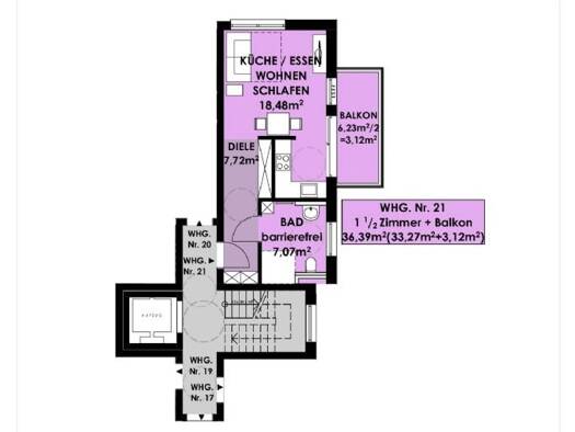Die Wohnung vefügt über 1 Zimmer mit einem offenen Küchenbereich und einem dazu anschlißenden Balkon. Das Badezimmer verfügt über eine Dusche ein Wachbecken und ein WC. Im Untergeschoss befindet sich der Fahrradraum zur gemeinschaftlichen Nutzung, sowie ein Keller zur alleinigen Nutzung. Auserhab der Wohnung gibt es noch einen Stellplatz zur Wohnung.
