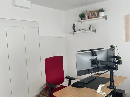 Die Wohnung befindet sich im Erdgeschoss eines Mehrfamilienhauses in Stuttgart- Untertürkheim. Fenster und Tür gehen zur Augsburger Straße heraus. Obwohl es sich um ein Erdgeschoss handelt, kommt viel Tageslicht durch die drei Fenster und die verglaste Tür. Auf der den Fenstern gegenüberliegenden Seite ist die Wand mit einem großen Einbauschrank bestückt, sodass hier viel Kleidung etc. untergebracht werden kann. Es gibt ein großes abgetrenntes Bad mit Dusche und nochmals separierter Toilette. I...