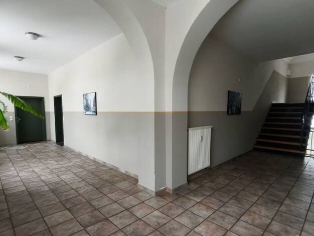 Die Wohnung befindet sich in einem ehemaligen Schulgebäude, welches über einen Aufzug verfügt. Vor und hinter dem Gebäude sind Grünflächen, die für gemütliche Grillabende o.ä. verwendet werden können. Die Wohnung befindet sich im 1.OG und hat eine Größe von 63,60m². Durch die großen Fenster ist die Wohnung insgesamt schön hell und lichtdurchflutet..