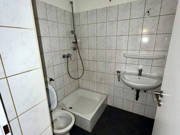 Objektbeschreibung Gepflegtes, modernes Mehrfamilienhaus mit 8 Wohneinheiten. Raumaufteilung Sehr schön geschnittene 2-Zimmer-Wohnung. Raufaser, weiß gestrichen, hochwertiger Laminatfußboden. Badezimmer mit Badewanne, Bad und Küche mit hellen Fliesen.