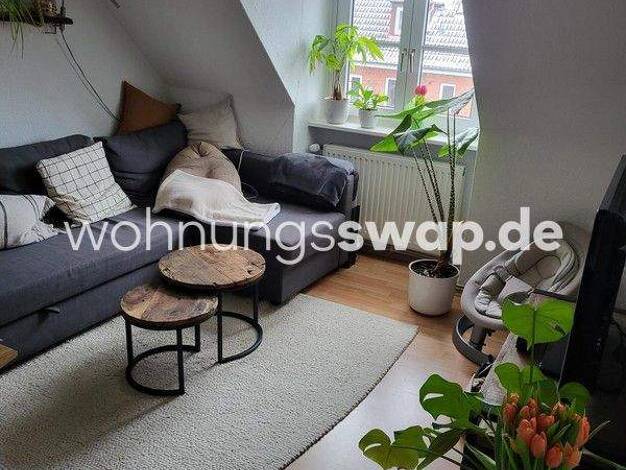 Wir tauschen eine Wohnung in Winterhude direkt im toller, ruhiger Lage gegenüber vom Stadtpark. Durch die Schrägen, ist die Grundfläche deutlich größer als die 48 Quadratmeter auf dem Papier und ermö...