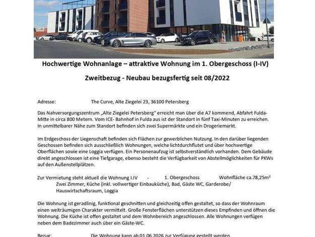 Im Erdgeschoss der Liegenschaft befinden sich Flächen zur gewerblichen Nutzung. In den darüber liegenden Geschossen befinden sich ausschließlich Wohnungen, welche lichtdurchflutet und über hochwertige Oberflächen sowie eine Loggia verfügen. Ein Personenaufzug ist selbstverständlich vorhanden. Dem Gebäude direkt angeschlossen ist eine Tiefgarage, ebenso besteht die Verfügbarkeit von Abstellmöglichkeiten für PKWs auf den Außenstellplätzen. Zur Vermietung steht aktuell die Wohnung I.IV-1. Obergesc...