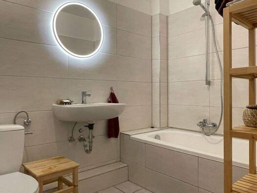 Diese ansprechende und lichtdurchflutete Wohnung überzeugt durch ihre moderne Ausstattung und eine durchdachte Raumaufteilung. Das modern gestaltete Badezimmer überzeugt durch seine helle und freundliche Atmosphäre. Weiße Wandfliesen in Kombination mit dunklen Bodenfliesen sorgen für einen zeitlosen und gepflegten Eindruck. Das Bad ist mit einer Badewanne inklusive Duschvorrichtung ausgestattet und bietet somit sowohl Komfort für ein entspannendes Bad als auch praktische Nutzung im Alltag. Ein ...