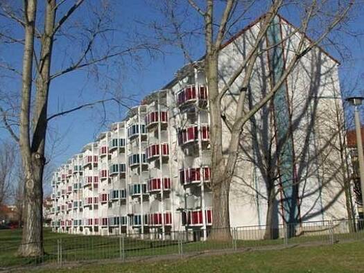 Das Wohnhaus Weferlinger Straße 1 bis 4 befindet sich in einer Sackgasse am Westrand der Beimssiedlung in einem sehr schönen grünen Wohngebiet. Die Balkone liegen auf der Ostseite des Objektes.