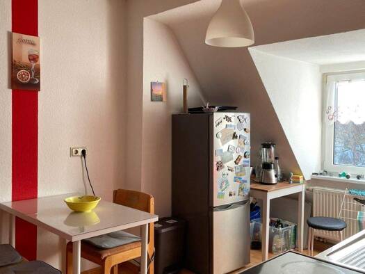 Objektbeschreibung Mehrfamilienhaus aus den 1930er Jahren. Raumaufteilung Die Wohnung liegt im Dachgeschoss des Hauses. Sie verfügt über zwei Zimmer, eine Küche sowie ein Bad mit Dusche. Die Böden sind mit Laminat belegt, die Nassbereiche sind gefliest, Zur Wohnung gehört ein Kellerraum. Die Möbel der Wohnung können für 250€ übernommen werden.