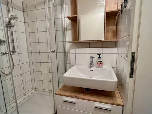 Hochwertig möbliertes und helles Apartment im Dörnberg Campus, mitten in Regensburg, im 1. Obergeschoss, straßenfern. Der Balkon auf der Südseite bietet einen Blick ins Grüne. Wohn- und Schlafraum, Dusche/WC, ca. 20,4 m². Schreinerangefertigte, hochwertige Vollmöblierung: 1,40 m breites Bett mit Lattenrost, große Schränke mit viel Stauraum. Einbauküche inkl. Ceranfeld, Kühl-Gefrierkombination, Mikrowelle mit Backfunktion. Geräumiges Bad mit hochwertiger Markenausstattung: große Regendusche mit ...