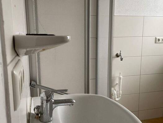 Die 2-Zimmer-Wohnung mit offenem Wohnzimmer und eingerichteter Küche teilt sich mit der Nachbarwohnung einen großen Balkon, der über einen Sichtschutz abgeteilt wird. Die Wohnung befindet sich im 1.Obergeschoss eines 6-Parteienhauses, der Gesamtzustand ist ordentlich. Die Hausordnung erledigen die Mieter im Wechsel. Wohndetails: Laminatboden in Wohn- und Schlafbereich Einbauküche (kostenfreie Nutzung möglich, kein Mietbestandteil) Tageslichtbad/WC/Pissoir mit Badmöbeln SAT-Anlage vorhanden Sons...