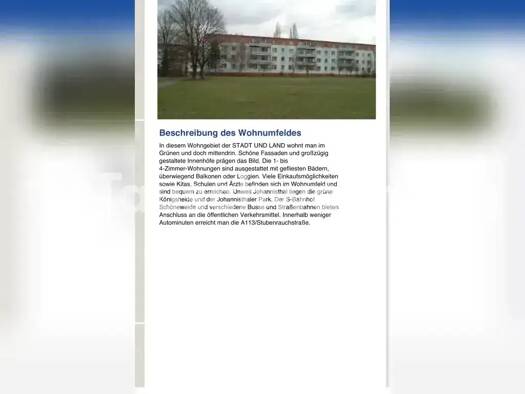 Es handelt es sich hierbei um ein Tauschangebot. (Anbieter-ID: 313203) Wir haben aktuell eine 3 Zimmer Wohnung in Berlin Plänterwald. Die Wohnung verfügt über ein Wohnzimmer, ein Schlafzimmer sowie ein kleines Kinderzimmer/Büro, eine separate Küche und ein Badezimmer mit Badewanne. Einen Balkon hat die Wohnung nicht. Zur Wohnung gibt es ein Kellerabteil. Der Bus ist in ca. 2 min. Fußweg zu erreichen, die S-Bahn in 10-15 (Plänterwald/Baumschulenweg). Im direkten Umfeld gibt es Schulen und Kitas ...
