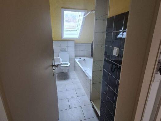 Die Wohnung ist im Dachgeschoss / 3. Stock eines 4-Familienhauses. Vor dem Haus befindet sich eine weitere Treppe. Sie betreten die Wohnung über das Treppenhaus in den Flur. Von dort geht es ab in das Wohnzimmer, das Schlafzimmer, die Küche mit mit Einbauküche und das Bad mit Dusche, Wanne und WC. Über eine Treppe im Flur kommen Sie in das Dachstudio das als Schlafzimmer genutzt werden kann. Die Wohnung wurde 2012 renoviert. In diesem Zuge wurde das Bad neu mit Wanne, Dusche und WC gebaut. Ein ...
