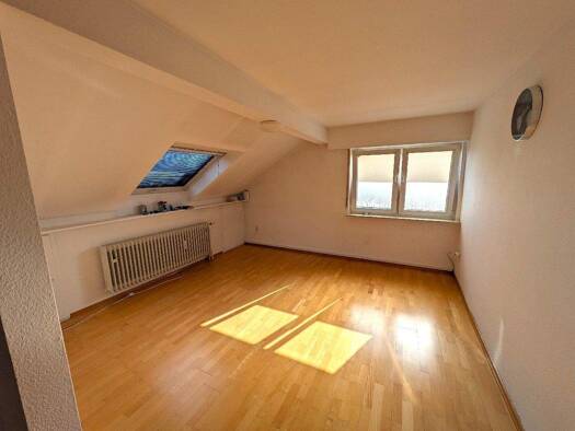 Diese helle Dachwohnung befindet sich ein einem ruhigen 3-Familienhaus. Der freundliche Wohn-Essbereich bietet Raum für gemütliches Wohnen. Die Küche ist abgeteilt und die Einbaumöbel können für eine Ablöse von 200,00 EUR übernommen werden. Ausgenommen ist der Kühlschrank. Ein geräumiges Schlafzimmer und ein Büro für Ihr Homeoffice warten auf Ihre Wohnideen. Das Badezimmer ist mit einer Wanne und Duschkabine ausgestattet. Ein Fenster sorgt für gute Belüftung. Ein Gäste-WC und der geräumige Abst...