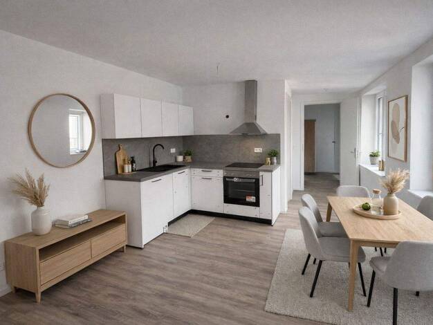 ***ERSTBEZUG: Mehrere Wohnungen verfügbar - Erstbezug nach umfassender Kernsanierung*** - 3× großzügige, moderne und helle 1,5-Zimmer-Wohnungen (im EG, 1.OG, DG) mit nahezu identischen Grundrissen/Ausstattung: großer Wohn-Schlaf-Essbereich, mit hochwertiger Ausstattung, neue Küche, neues Bad, Fußbodenheizung, Waschmaschinen-Mitbenutzung im Keller, energetisch top saniert (KfW70EE Wärmepumpe, PV, Be-&Entlüftung der Räme usw): jeweils ca. 34m2, jeweils Kaltmiete 750,- + 100,- NK-VZ = 850,- Ge...