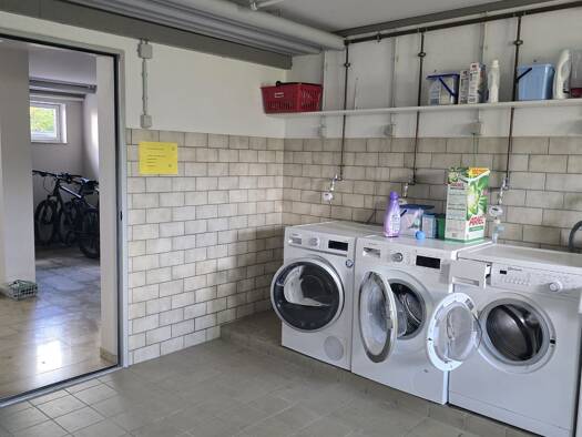Flur, Wohnzimmer mit Zugang zum Südbalkon, Schlafzimmer, zwei Kinderzimmer, Wohnküche, innenliegendes Bad mit Badewanne, Gäste-WC, Kellerraum, Fahrradkeller, Gemeinschaftswaschküche für Waschmaschine und Trockner.