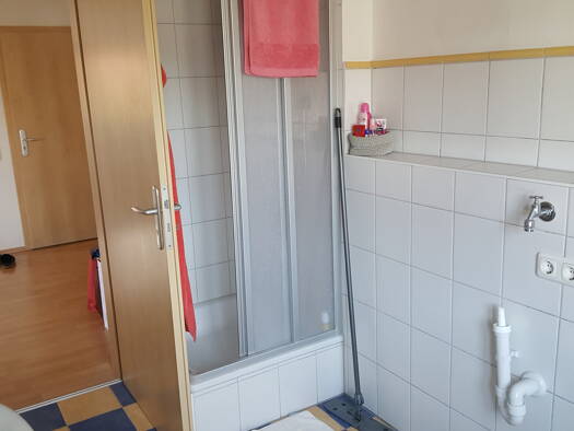 Im 1. Obergeschoss des ehemaligen Wohn- und Geschäftshauses in der Hauptstraße 20 sind 3 Wohnungen neu konzipiert und gestaltet worden. Bei der dargestellten Wohnung handelt es sich um die Wohnung Nr. 2. Die Beheizung erfolgt über eine Erdgas-Zentralheizung und die Warmwasseraufbereitung über einen Elektroboiler im Badezimmer. Das Badezimmer ist mit großflächigen Fliesen ausgestattet und beinhaltet eine große Dusche, Badewanne, Waschbecken, WC, Handtuchtrockner und einen Waschmaschinenanschluss...
