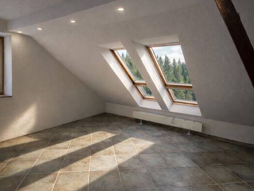 Dachgeschosswohnung mit zwei Zimmern, hellem Bad mit Wanne, kleiner Küche mit Einbauküche, sonniger Loggia.