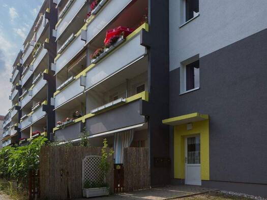 Das fünfgeschossige, sanierte Wohnhaus liegt nahe der Heide im landschaftlich reizvollen Norden von Halle. Die zentrale Lage innerhalb des Wohngebietes zeichnet diesen Standort aus. Der Wohnkomplex II ist sehr ruhig und stark begrünt. Zahlreiche Kinderspielplätze, ein Basketballplatz und ein Kindergarten machen das Wohngebiet für Familien attraktiv. Die Schulen befinden sich im I. WK und sind in ca. 10 Minuten zu erreichen. Die nahe Heide lädt zum Entdecken und zur Erholung ein.