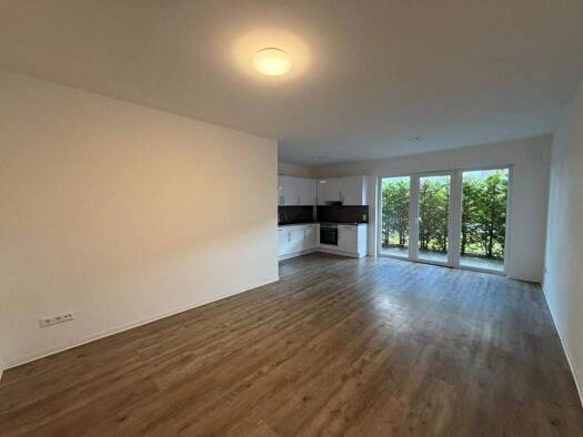 Die Neubauwohnung im 2. Obergeschoss ist mit einem modernem Aufzug ausgestattet. Man gelangt durch eine weißlackierte Wohnungstür in einen Vorflur, von dem ein Bad abgeht. Weiter gelangt man mit dem schönem Design Holzoptikbelag in den großzügigen großen hellen Wohn-, Ess- und Kochbereich. Der bodentiefe Duschbadbereich ist gefliest. Die Einbauküche ist zusätzlich mit einer Geschirrspülmaschiene ausgestattet. Die qualitativ sehr hohe Ausstattung der Wohnung wird im Oberboden durch Holzoptik for...