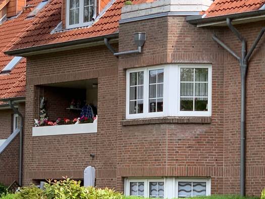 Die gepflegte Wohnanlage im Kreuzweg liegt sehr ruhig und abgeschirmt von der Straße in zweiter Baureihe. Die Gebäude sind von einer gepflegten Grünanlage umgeben, die auch einen Spielplatz umfasst. Die Gebäudefassaden wurden umfassend saniert und mit einem energieeffizienten Wärmedämmverbundsystem versehen, wodurch die Heizkosten signifikant gesunken sind. Kostenlose Stellplätze sind im Innenhof vorhanden
