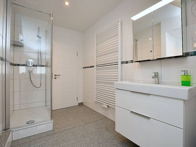Es befinden sich neben dem Bad mit Dusche und WC ein Gäste WC sowie eine große Einbauküche mit Herd und Ceranfeld in der Wohngemeinschaft. Im Badezimmer gibt es zwei Waschbecken und eine große Dusche