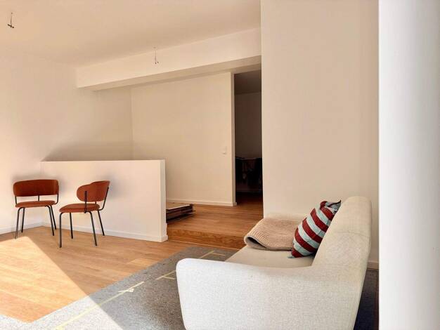 Die 54 qm große Studio-Wohnung mit Terrasse liegt im Innenhof in Südausrichtung. Der Schlaf- sowie der Küchenbereich befinden sich auf einer 15 cm hohen Empore. Fußbodenheizung, hochwertiges Eichenpa...