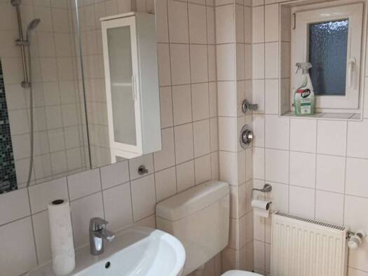 Objektbeschreibung Schöne kleine frisch renovierte Wohnung im Erdgeschoss mit kleiner Terrasse, offener funktionalen Küche, einem großen Einbauschrank im Flur und einem frisch sanierten Duschbad mit Waschmaschine. Die Wohnung ist möbliert und für mind 6 Monate verfügbar. Raumaufteilung Ein großes Wohnzimmer mit offener Küche und Essbereich ist eingeteilt in „Fernsehbreich“ mit ausziehbarem Schlafsofa, TV und „Arbeitsbereich“ mit Schreibtisch, direkt an der hellen Fensterfront. WLAN ist vorhande...