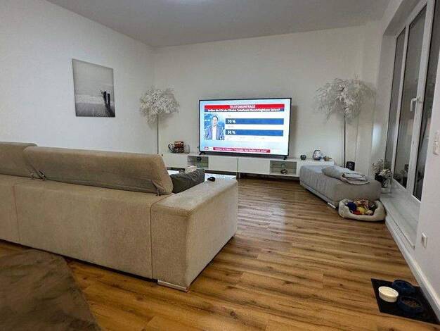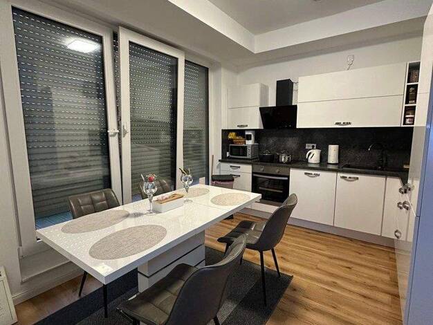 Komplett möblierte und ausgestattete 2-Zimmer-Wohnung (61 m²) im Erdgeschoss, mit separater Küche und Terrasse sowie privatem Außenparkplatz. Gasheizung (Zentralheizung mit Boiler) Möbel und Geräte K...