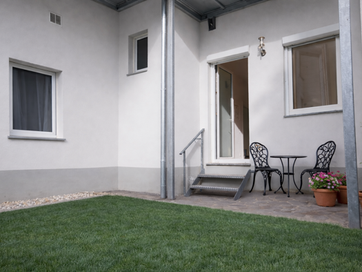 Objektbeschreibung kleine, ruhig gelegene Wohnanlage Bodenbelag: Laminat, Bad gefliest, Wände weiß neu gestrichen Badezimmer mit Fenster, Badewanne, Dusche, WC und WT große Terrasse von ca. 15qm 1Auß...