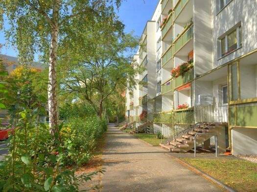 Unser Wohngebiet Elsteraue zeichnet sich durch eine ruhige, grüne Lage aus. Die sechsgeschossigen Wohnhäuser mit gepflegten Vorgärten sind von großzügigen begrünten Freiflächen umgeben, die mit Trockenplätzen und zahlreichen Sitzmöglichkeiten ausgestattet sind. Ein neuer Spielplatz im weitläufigen Innenhof lässt Ihre Kinder gefahrlos spielen. Tischtennisanlagen und ein Bolzplatz im Wohngebiet bieten den Kindern beste Möglichkeiten sich auszutoben.