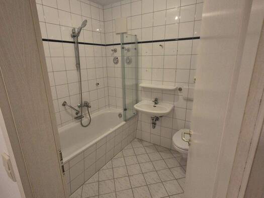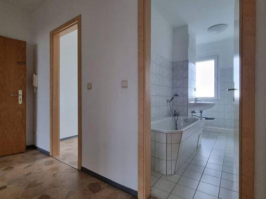 Objektbeschreibung Geräumige 2-Raum-Wohnung mit Balkon am Wohnzimmer. Bad mit Badewanne, große Küche mit Fenster, neue Bodenbeläge Raumaufteilung Alle Räume sind vom Flur aus begehbar.