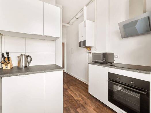 Die 2 Zimmerwohnung im 4. Obergeschoss ist perfekt für eine 2 er Wohngemeinschaft aufgeteilt. Beide Zimmer sowie Küche und Bad sind vom Flur aus zu begehen. Das große Zimmer mit 27 m² bietet viel Platz zum gemütlichen Wohnen. Die Küche ist mit einer Einbauküche ausgestattet. Das Bad verfügt über ein Oberlicht und eine Dusche sowie Platz für eine Waschmaschine.