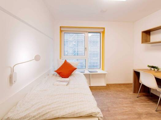 Das Zimmer 4 ist zum Hinterhof gerichtet. Der große Wohnraum bietet ausreichend Platz für Ihre persönlichen Sachen. Das Tageslichtbad ist mit einer Dusche ausgestattet.