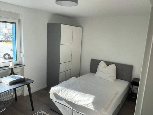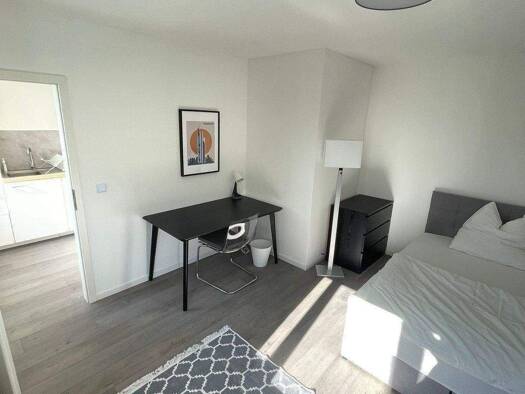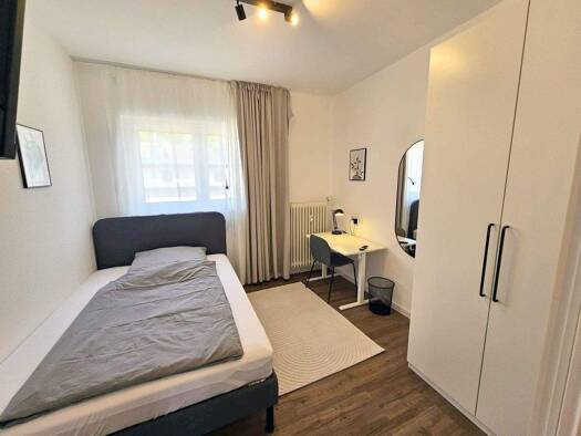 Die Ausstattung der Zimmer beinhaltet ein bequemes Boxspringbett, teilweise beleuchteter Kleiderschrank, Flachbild TV, Beistelltische, Schreibtisch, Schreibtischstuhl, Bettzeug (Kopfkissen 80×80, Bettdecke 140×200) und die passende Bettwäsche. Darüber hinaus verfügt die WG über einen zentralen kostenlosen WLAN Zugang (25.000 kBit/s) für alle WG Bewohner. Die Küche der Wohngemeinschaft verfügt über eine Küchenzeile mit Kochfeld, Backofen und Spülmaschine. Auch ein Münz-Waschtrockner ist vorhande...
