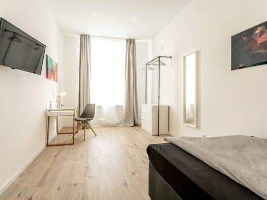 Die Zimmer sind modern möbliert und ausgestattet. Die 3m hohe Decken vermitteln ein angenehmes Wohngefühl. Jedes dieser Zimmer ist mit Bett inkl. Bettzeug und Bettwäsche, Schrank, Schreibtisch, Stuhl und auch kostenlosem W-Lan Zugang ausgestattet. Für alle Mitbewohner der Wohngemeinschaft zur gemeinsamen Nutzung steht die komplett möblierte Küche zur Verfügung. Diese ist mit einer modernen neuen Küchenzeile ausgestattet inkl. Geschirr, Besteck und Kochutensilien. Das Bad ein modernes Tageslicht...