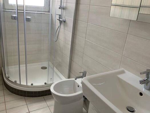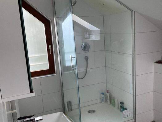 Es befinden sich neben dem Bad mit Dusche und WC ein Gäste WC sowie eine große Einbauküche mit Herd und Ceranfeld in der Wohngemeinschaft. Im Badezimmer gibt es zwei Waschbecken und eine große Dusche