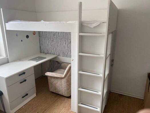 Das Zimmer befindet sich in einer Wohngemeinschaft (WG) mit gemeinsam genutztem Badezimmer sowie einer Gemeinschaftsküche, ausgestattet mit Spüle, Herd und Kühlschränken. Eine Waschmaschine steht all...