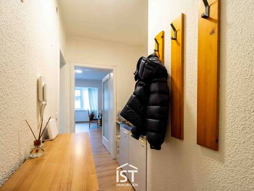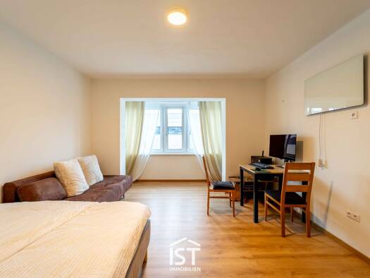 Diese möblierte Garconniere mit einer Wohnnutzfläche von rund 32 m² befindet sich im Zentrum von Braunau am Inn und ist ideal für eine Einzelperson geeignet. Die Wohnung liegt im Erdgeschoss eines Mehrparteienhauses und verfügt über einen kleinen Vorraum. Dieser ist mit einer kompakten Teeküche inklusive Kühlschrank und zwei Herdplatten ausgestattet. Von hier aus gelangen Sie direkt in den Wohn-, Ess- und Schlafbereich. Dank der vorhandenen Möblierung mit Wohnwand, Schlafcouch, Tisch und Stühle...