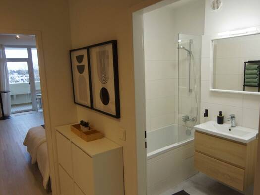 Diese lichtdurchflutete 1-Zimmer-Wohnung befindet sich im 6. Obergeschoss eines Neubaus, der Teil des neuen Premium-Quartiers "Kupa" ist. Den Bewohnern steht ein wegweisendes Sharing- und Service-Kon...