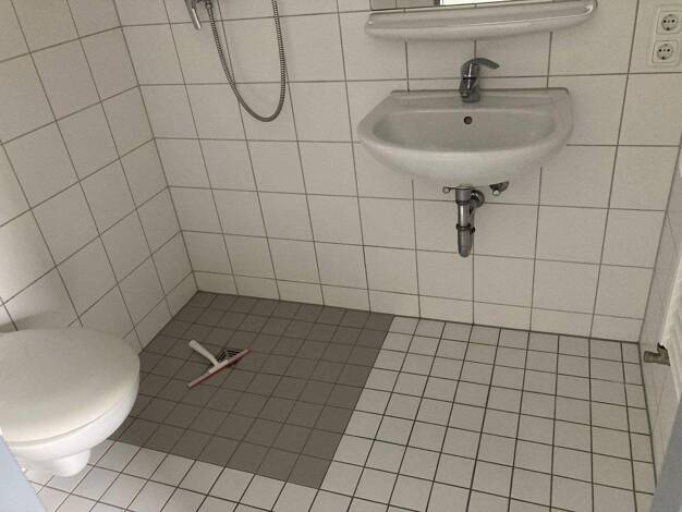 Diele, Küchenbereich und Bad haben Fliesenböden. Der Wohn-Schlafbereich mit bodentiefen Fenstern ist mit Laminat belegt. Im Wohnbereich ist eine Single-Küche mit 2-Plattenceranfeld, Spüle und Kühlsch...