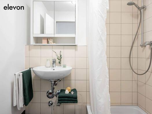 Diese helle und freundliche 1-Zimmer-Wohnung im 3. Stock verfügt über eine gehobene Innenausstattung. Das Badezimmer ist mit bodentiefer Dusche, Fenster, Waschbecken mit Spiegelschrank, Toilette und passenden Lampen ausgestattet. Die Küche wird für 50 € monatlich vermietet (in den NK enthalten) und ist vollständig ausgestattet mit Kühlschrank mit Eisfach, Spülmaschine, Backofen, Mikrowelle, 2-Platten-Kochfeld, Spüle und vielen Schränken. Eine Esstheke mit zwei Hochstühlen lädt zum Essen ein. Zu...
