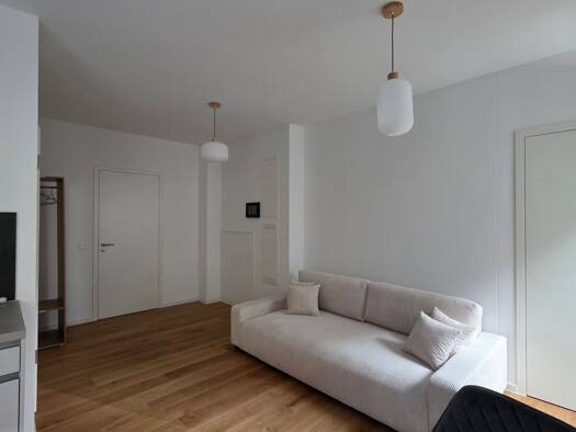 Diese helle und freundliche 1-Zimmer-Wohnung im 3. Stock verfügt über eine gehobene Innenausstattung. Das Badezimmer ist mit bodentiefer Dusche, Fenster, Waschbecken mit Spiegelschrank, Toilette und passenden Lampen ausgestattet. Die Küche wird für 50 € monatlich vermietet (in den NK enthalten) und ist vollständig ausgestattet mit Kühlschrank mit Eisfach, Spülmaschine, Backofen, Mikrowelle, 2-Platten-Kochfeld, Spüle und vielen Schränken. Eine Esstheke mit zwei Hochstühlen lädt zum Essen ein. Zu...