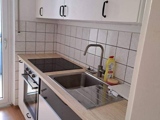 Objektbeschreibung Hübsche, helle und gutgeschnittene 1-Zimmer-Wohnung mit Balkon im 1. OG eines kleineren MIetwohnhauses. Raumaufteilung Großes Wohnzimmer mit einer Schlafnische, seperate kleine Küc...