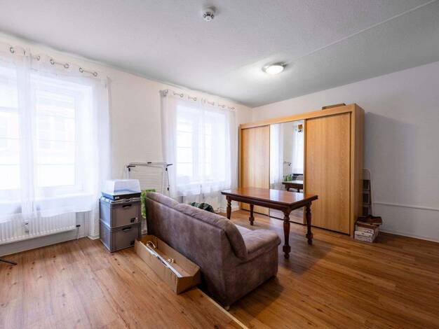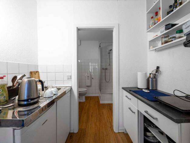Es handelt sich um ein 1-Zimmer-Apartment im Obergeschoss, bestehend aus einem großen Wohn-/Schlafraum, der mit Linoleum ausgelegt ist. Bitte schauen Sie sich den Grundriss der Wohnung an. Im Flur befindet sich eine neue Pantry-Küche, bestehend aus einem Kühlschrank mit Gefrierfach, einer Edelstahlspüle und einem Elektroherd mit zwei Kochplatten. Das Duschbad ist weiß gefliest. Im Bad befindet sich neben dem WC, eine Dusche und ein Waschbecken mit Spiegel. Glasfaser-Anschluss ist vorhanden. Mit...