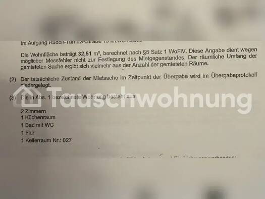 Es handelt es sich hierbei um ein Tauschangebot. (Anbieter-ID: 342346) Wir wohnen derzeit in einer geräumigen 2-Raum Wohnung (69 Quadratmeter) in der KTV. Aufgrund verschiedener Gegebenheiten, würden wir diese gerne gegen eine 3-Raum Wohnung (optional mit Balkon) tauschen. Diese Anzeige wurde von einem Nutzer eingestellt. Tauschwohnung.com stellt nur die Plattform bereit und ist nicht Anbieter der Wohnung. Hinweise auf mögliche Rechtsverletzungen (z. B. bei Fotos) bitte hier melden: https://www...