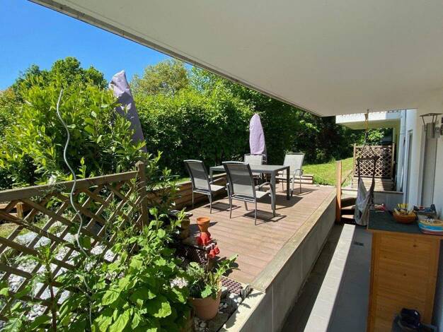 2-Zi.-Terrassen-Wohnung mit eigenem Garten im Grünen, Höhenlage in Deggendorf, Nh. Stadt-Au! ca. 59 m2 Wfl. (UG) in Mehrfamilienhaus mit 6 Einheiten BJ 1991 - gr. Holz-Terrasse (ca. 12 m2) - herrl. G...