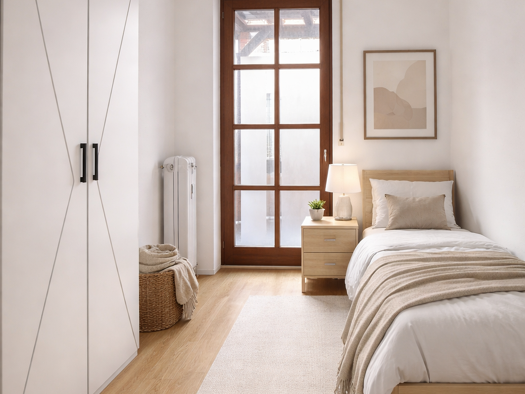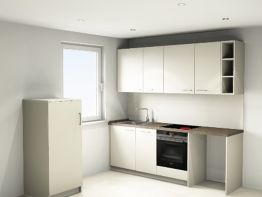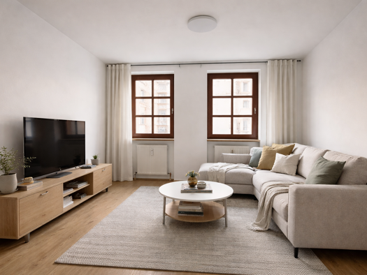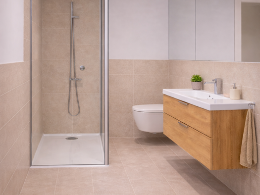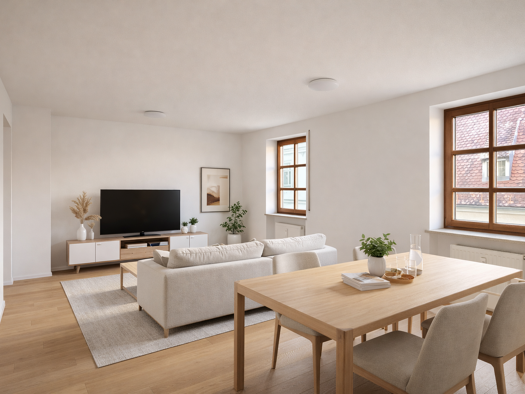 Die Wohnung im 1. OG weist insgesamt eine Wohnfläche von 68,41 m² inkl. Dachterrasse (10,68 m² = Anteil 50 %), verteilt auf 2 Zimmer, Bad und Flur und wurde mit einem hochwertigen Echtholz-Parkett sowie einer Fußbodenheizung ausgestattet. Die Besonderheit hierin liegt, dass diese auch zur Kühlung hergenommen werden kann. Das Tageslichtbad, welches mit einer bodengleichen Dusche, einer Badewanne, einem Waschbecken, einem WC sowie einem Waschmaschinenanschluss versehen ist, wurde mit hochwertigem...