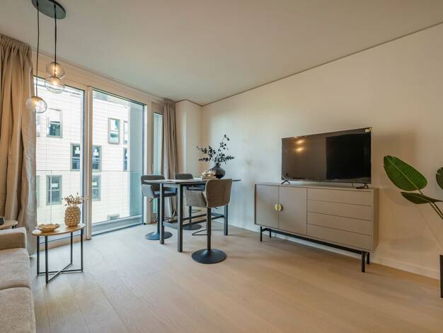 Diese 2-Zimmer-Wohnung überzeugt durch modernes Design, hohen Wohnkomfort und eine durchdachte Raumaufteilung. Der großzügige Wohn- und Essbereich mit offener Küche besticht durch bodentiefe Fenster, die viel Tageslicht hereinlassen. Das separate Schlafzimmer bietet einen ruhigen Ort zum Entspannen und ausreichend Platz für persönliche Gestaltungsideen. Hochwertiges Parkett und ausgesuchte Materialien verleihen den Räumen eine warme und stilvolle Atmosphäre. Die moderne Einbauküche mit hochwert...