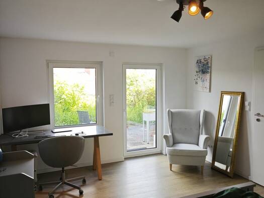 2 Zimmer, Küche, Bad, Abstellraum. Terrasse, Garten, Südseite Neue Einbauküche. Für eine Person.
