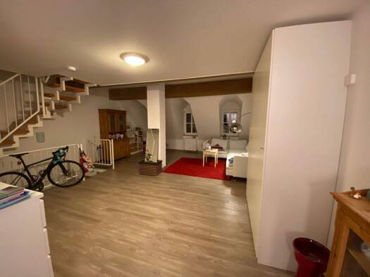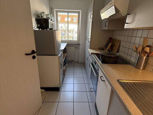 Attraktive 2-Zimmer-Wohnung: Helle, lichtdurchflutete Wohnung in einem denkmalgeschützten Sandsteinhaus, aufwändig saniert, mit einer modernen Einbauküche mit Geschirrspüler, teilmöbliert mit hellen Einbaumöbeln, (ein Sofa muss mitgebracht werden), Bad mit Fenster, Dusche und Waschtrockner, Schlafzimmer mit Arbeitsecke, überdachter Balkon zum ruhigen Hinterhaus-Garten, zugehöriger Tiefgaragenstellplatz um die Ecke